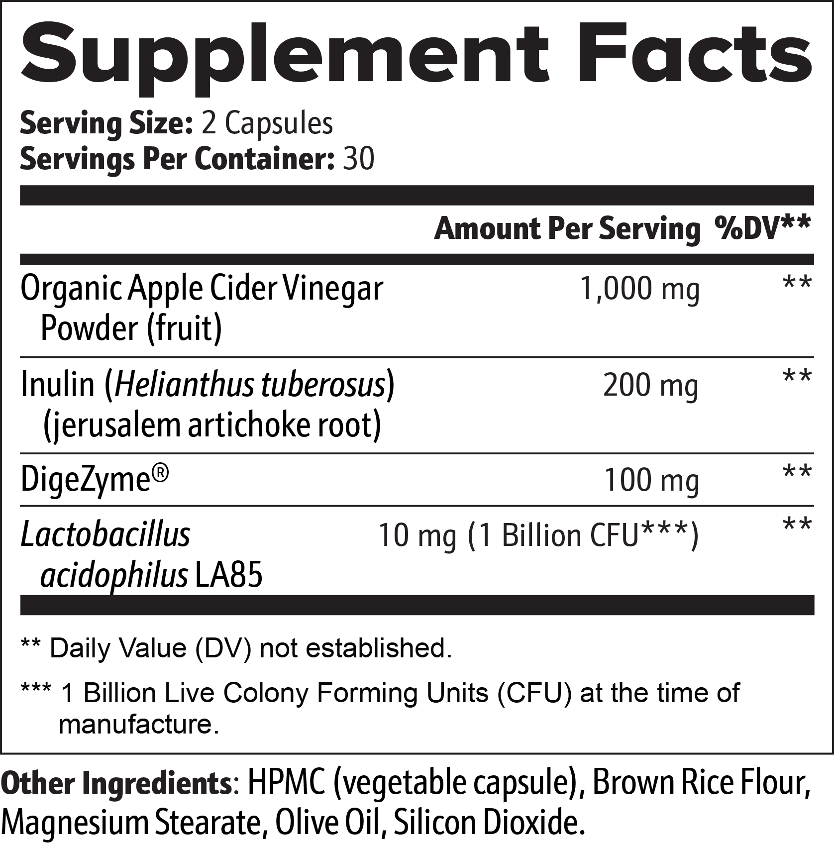 Ingredients: Organic Apple Cider Vinegar Powder (fruit), Inulin (Helianthus tuberosus) (Jerusalem artichoke root), Lactobacillus acidophilus LA85 (Inulin carrier), DigeZyme®.